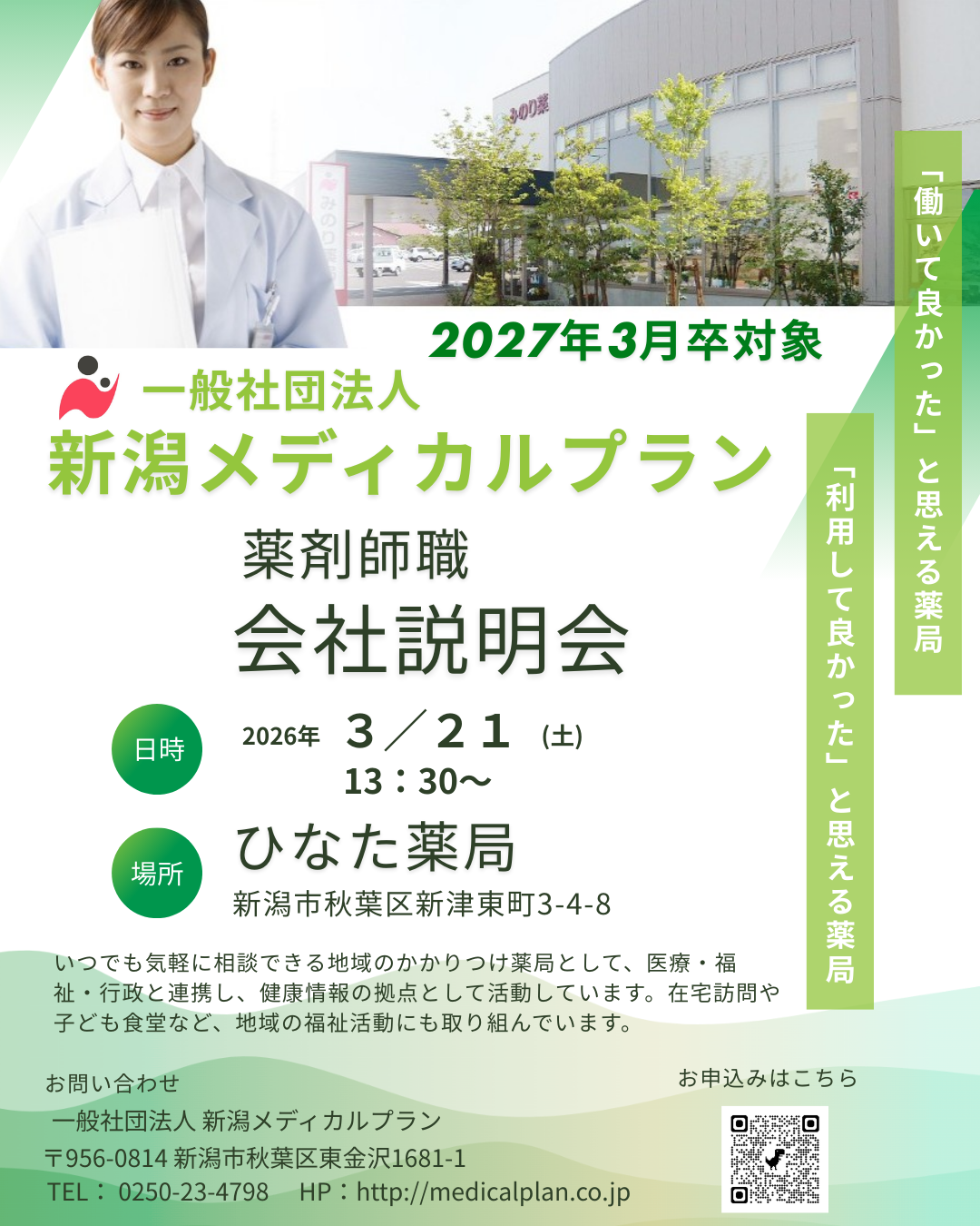 新潟メディカルプランは、「利用して良かった。働いて良かった」と思える薬局を目指します。